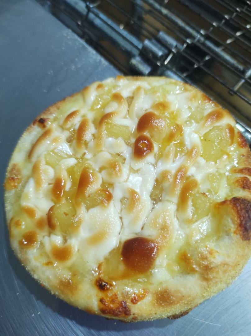 MASSA LEVINHA, MUSSARELA, ABACAXI CARAMELIZADO E CHOCOLATE BRANCO POR CIMA. INDO AO FORNO, FORMANDO AQUELA CROSTINHA MARAVILHOSA