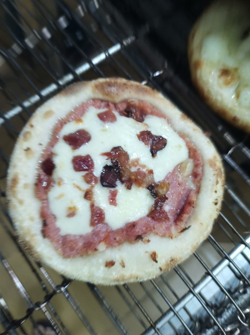 Deliciosa Esfiha Com Massa Fofinha, Calabresa Defumada Temperada Com Tomate E Cebola Picadinhos E Com Delicoso Catupiry Sem Amido e Bacon frito.